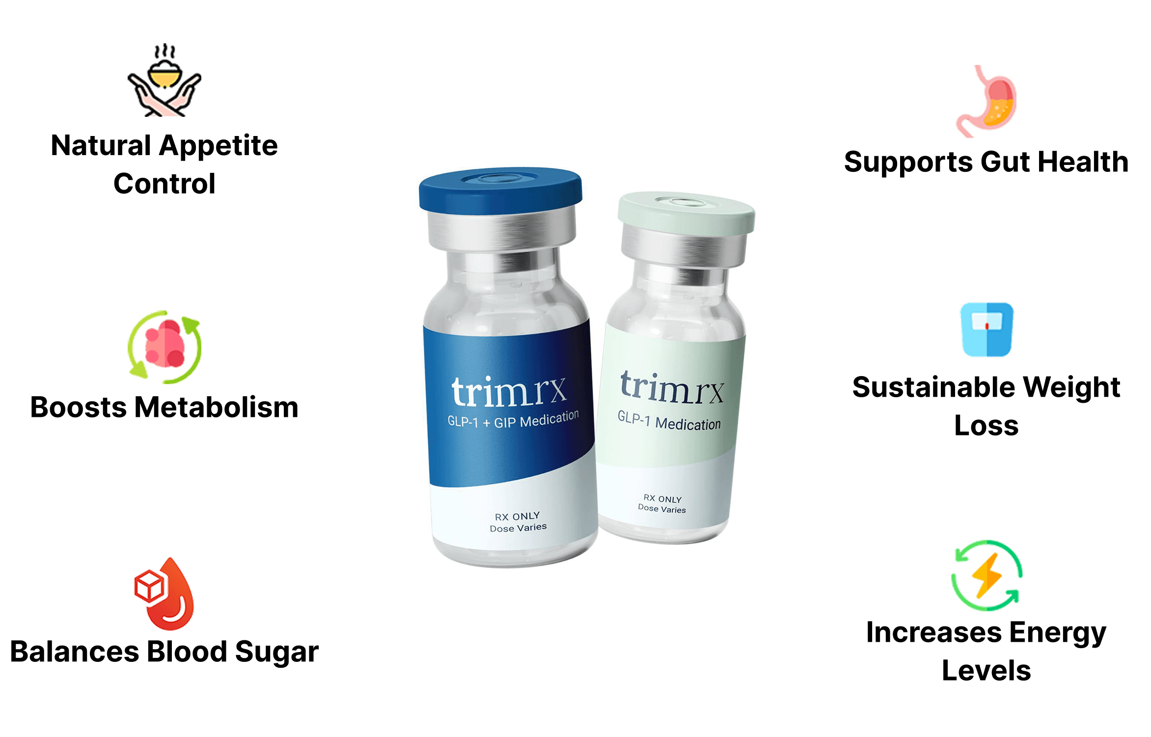 The patent pending formula in Trimrx GLP-1 Medication stabilizes your blood sugar levels automatically! With just the first dose your body starts burning body fat all on it's own. Without changing your diet or exercise routine!