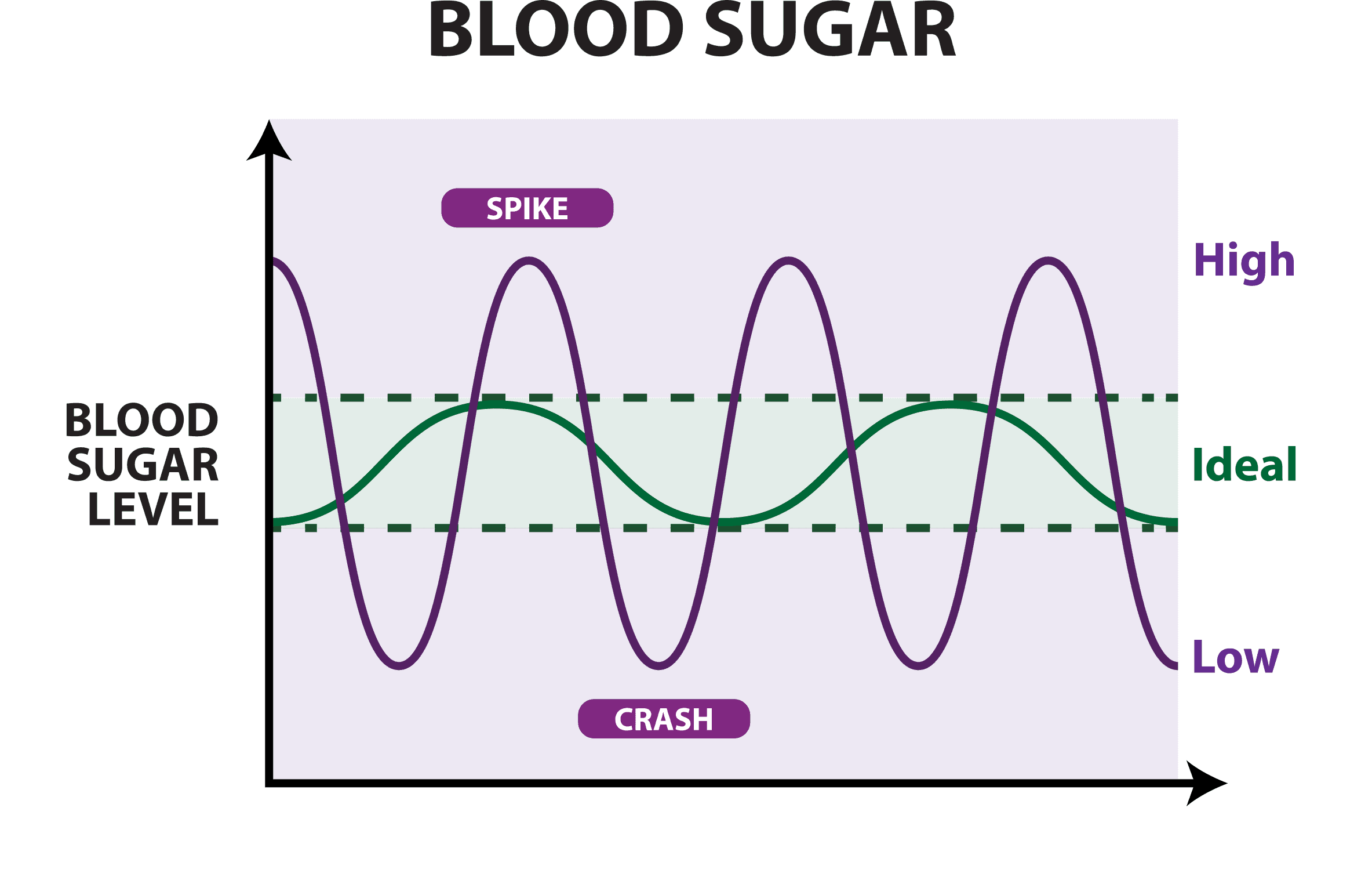 This “blood sugar rollercoaster” is how most people live everyday, and it will have you constantly snacking and never feeling satisfied. Your body will produce more body fat during the spikes, and hold on to stubborn body fat during the crashes - making it almost impossible to lose weight!